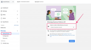 بعد ذلك ستلاحظ ظهور خيار الواتساب على الجانب الايمن اضغط على بدء الاستخدام ثم اختر مدير اعمال ميتا اذا لم يكن لديك مدير اعمال ميتا فسيتم انشاء واحد تلقائي لك